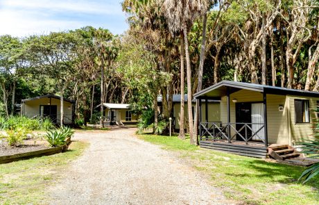 Welcome to the Glades – cabin accommodation situated in the Palm Forest with views through to the lake.