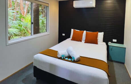 Located on the lakeside amongst the cabbage tree palms and right next to the Lagoon style swimming pool, the Lodge rooms use the shared camping amenities and have 2x single beds in each room.